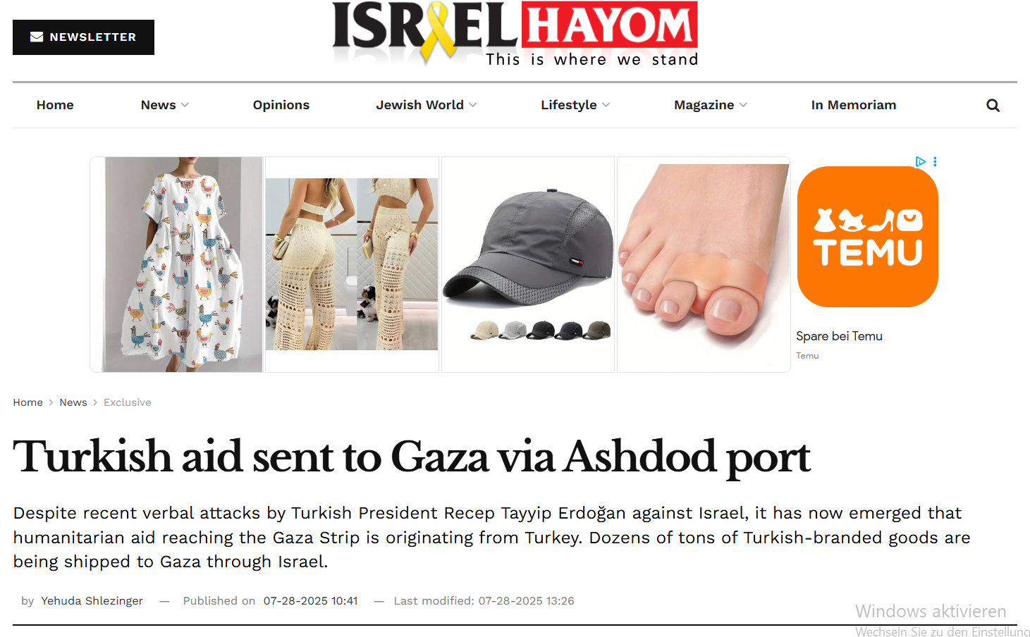 Vom Anlegen des Schiffes. türkischen Schiffes berichtet auch die israelisches Zeitung Haymon.